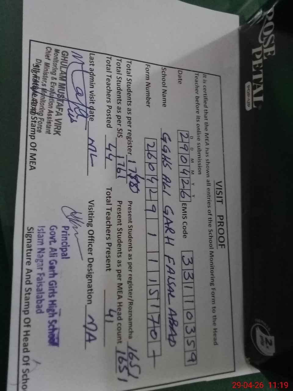 | Attendance Register | Head Teacher | MEA with School | Visit Proof |