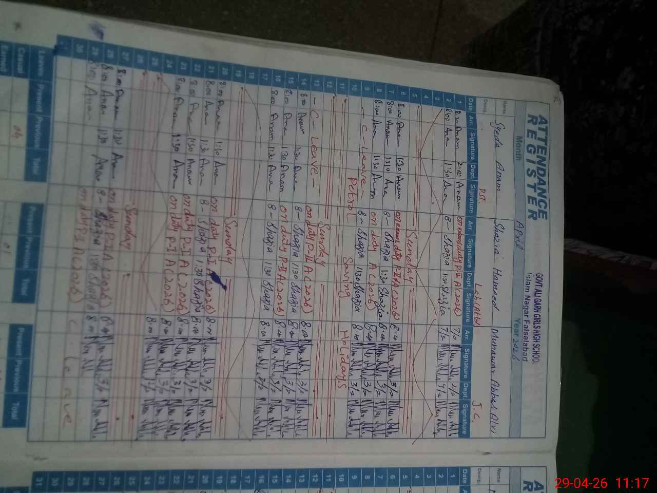 | 33**** | Az**** Pa**** | PST Arts | Regular | 0 | 0 | 0 | 0 | 0 | 0 | 0 | 0 | 0 | Exam Duty |
