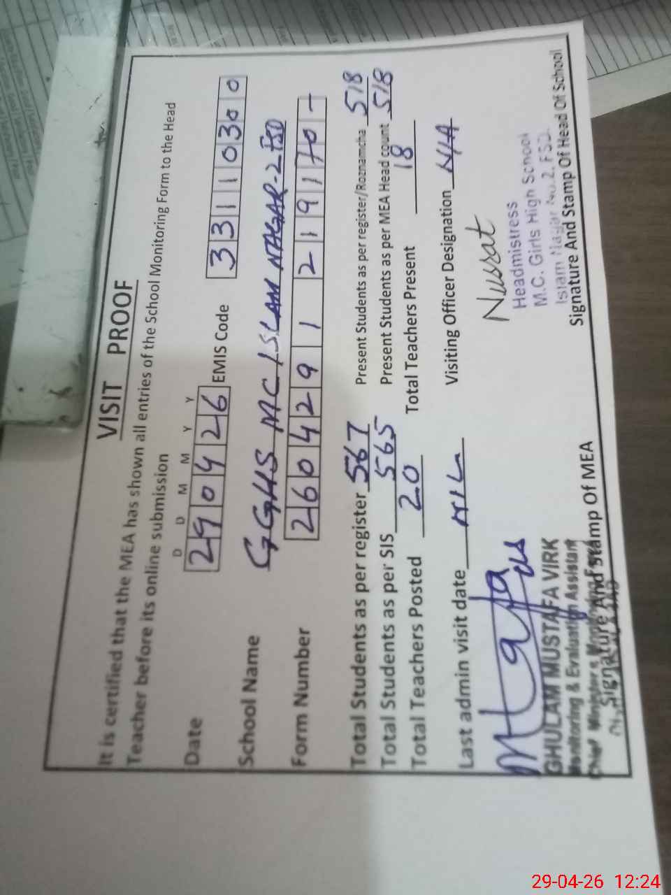 | Attendance Register | Head Teacher | MEA with School | Visit Proof |