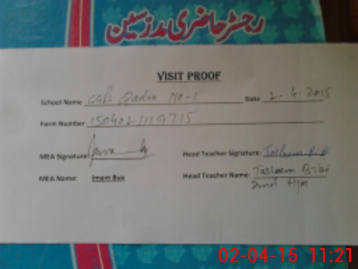 | Attendance Register | Head Teacher | MEA with School | Visit Proof |
