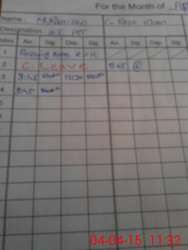 | CNIC | Full Name | Designation | R/C | Absence During Last Calender Month |