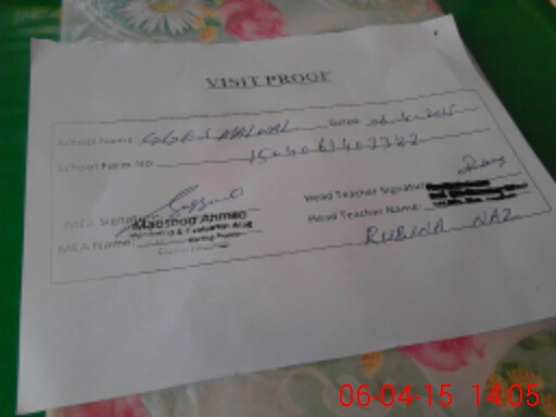 | Attendance Register | Head Teacher | MEA with School | Visit Proof |
