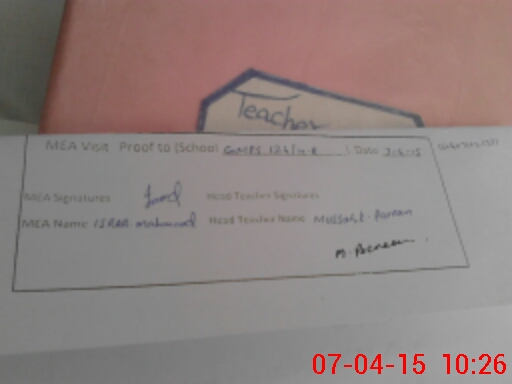 | Attendance Register | Head Teacher | MEA with School | Visit Proof |