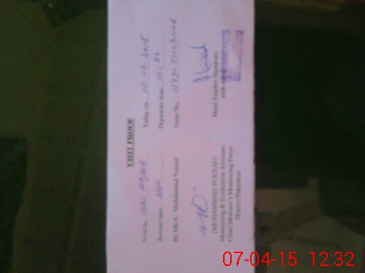 | School Visited by School Health & Nutrition Supervisor (No. of Visits) | 1 | Name1: | Abdul Rauf Khan | Name2: | |