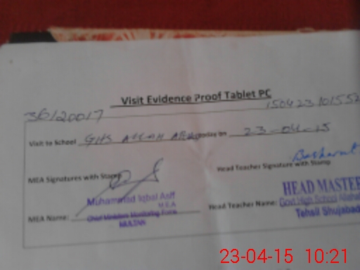 | Attendance Register | Head Teacher | MEA with School | Visit Proof |