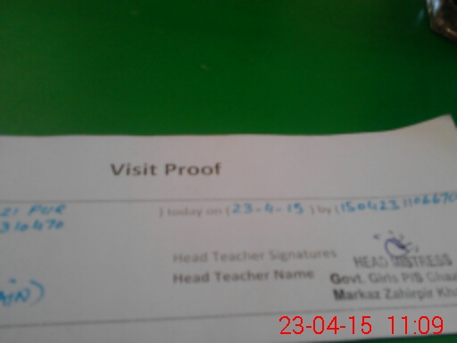 | School Visited by School Health & Nutrition Supervisor (No. of Visits) | 1 | Name1: | Irfan Mehmood | Name2: | Nil |