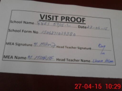 | Attendance Register | Head Teacher | MEA with School | Visit Proof |