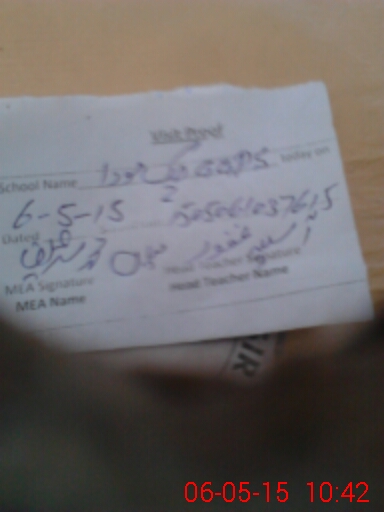 | School Visited by School Health & Nutrition Supervisor (No. of Visits) | 1 | Name1: | Rizwan Ahmed | Name2: | |