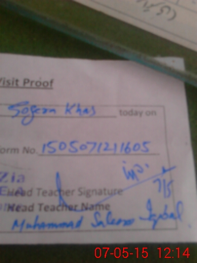 | School Visited by School Health & Nutrition Supervisor (No. of Visits) | 1 | Name1: | Iftairkhar Hussain | Name2: | |