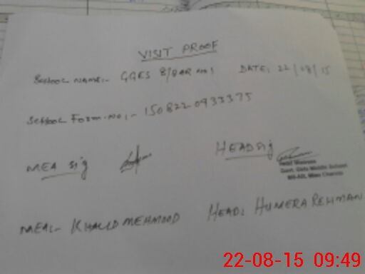 | School Visited by School Health & Nutrition Supervisor (No. of Visits) | 1 | Name1: | Abida Naseem | Name2: | |