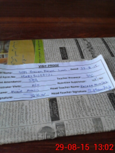 | School Visited by School Health & Nutrition Supervisor (No. of Visits) | 1 | Name1: | ANEELA NAZIR | Name2: | NIL |