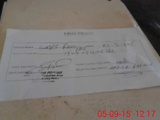 | Attendance Register | Head Teacher | MEA with School | Visit Proof |