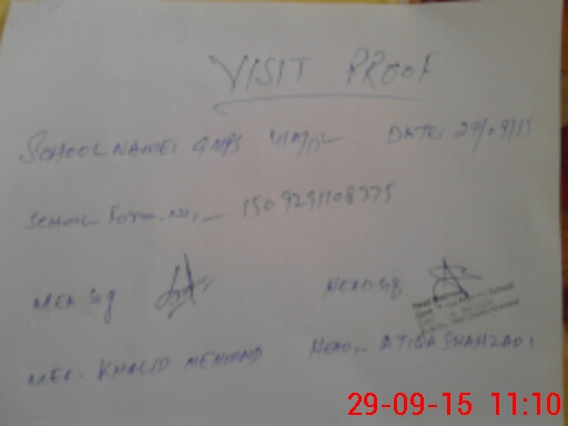 | School Visited by School Health & Nutrition Supervisor (No. of Visits) | Name1: | Kousar Hameed | Name2: | ||