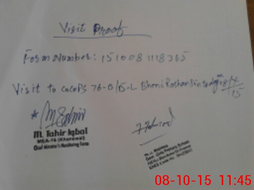 | Monitoring Date: 08-10-2015 | Start Time: 08-10-2015 11:18 AM | End Time: 08-10-2015 11:47 AM | Name of MEA: M.Ta**** Iq**** (S**** | |