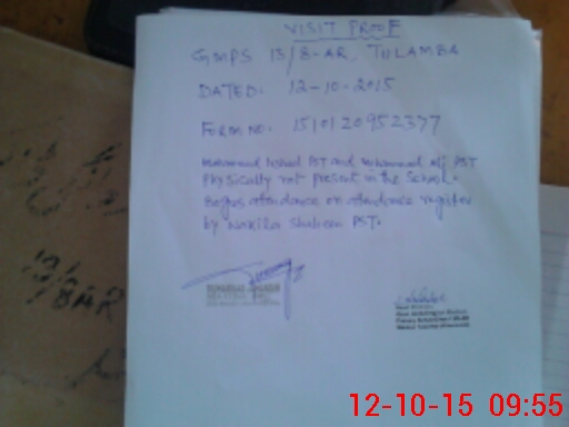 | Remarks (Use Separate Page if Required): MOHAMMAD IRSHAD PST AND MOHAMMAD ALI PST PHYSICALLY NOT PRESENT IN THE SCHOOL BOGUS ATTENDANCE ON ATTENDANCE REGISTER BY WAKILA SHAHEEN PST | |||||