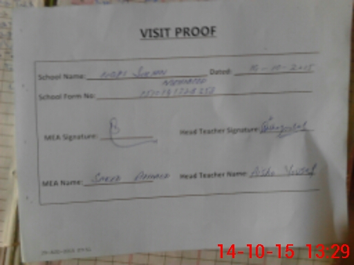 | Attendance Register | Head Teacher | MEA with School | Visit Proof |