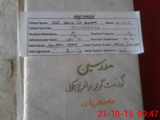 | School Visited by School Health & Nutrition Supervisor (No. of Visits) | 1 | Name1: | Javed Maqsood | Name2: | |