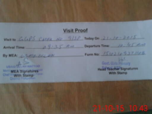 | School Visited by School Health & Nutrition Supervisor (No. of Visits) | 1 | Name1: | ATIF FARID CHISHTI | Name2: | |