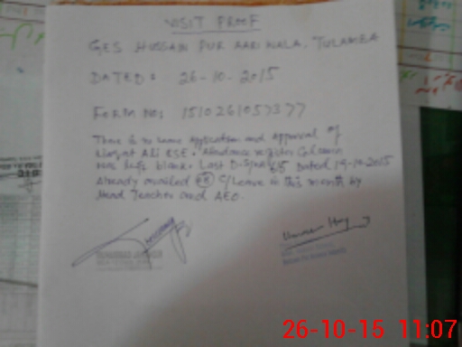 | Remarks (Use Separate Page if Required): THERE IS NO LEAVE APPLICATION AND APPROVAL OF LIAQAT ALI ESE ATTENDANCE REGISTER COLUMN WAS LEFT BLANK LAST DIARY SNO 615 DATED 19 OCT 2015 ALREADY AVAILED 08 CASUAL LEAVE IN THIS MONTH BY HEAD TEACHER AND AEO | |||||
