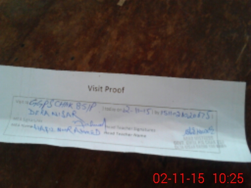 | School Visited by School Health & Nutrition Supervisor (No. of Visits) | Name1: | Jawad Manzoor | Name2: | Null | |