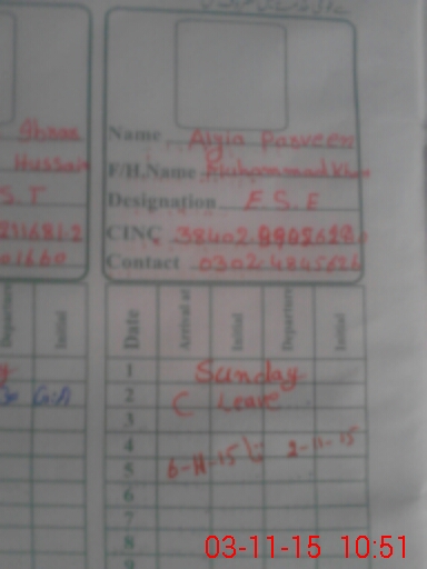 | CNIC | Full Name | Designation | R/C | Absence During Last Calender Month |