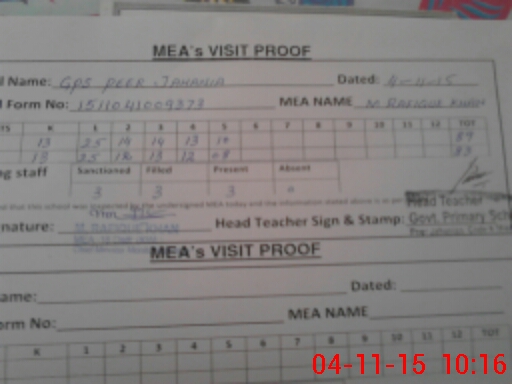 | Attendance Register | Head Teacher | MEA with School | Visit Proof |