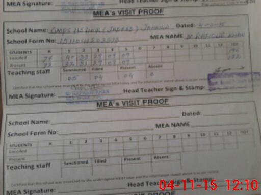 | Attendance Register | Head Teacher | MEA with School | Visit Proof |