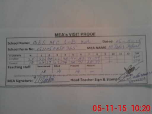 | Attendance Register | Head Teacher | MEA with School | Visit Proof |
