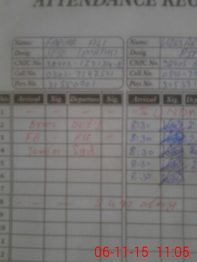 | CNIC | Full Name | Designation | R/C | Absence During Last Calender Month |