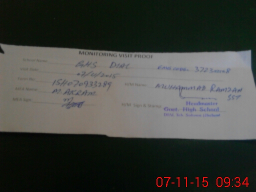 | School Visited by School Health & Nutrition Supervisor (No. of Visits) | 1 | Name1: | Waheed Akhter | Name2: | |