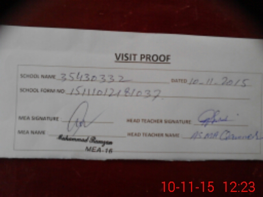 | Attendance Register | Head Teacher | MEA with School | Visit Proof |