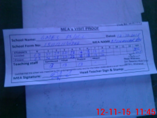 | Attendance Register | Head Teacher | MEA with School | Visit Proof |