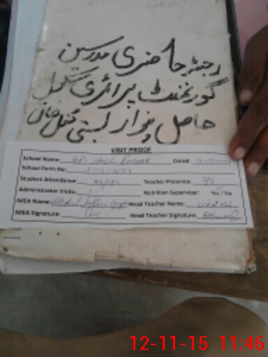 | School Visited by School Health & Nutrition Supervisor (No. of Visits) | 1 | Name1: | Karim Nawaz | Name2: | Nill |