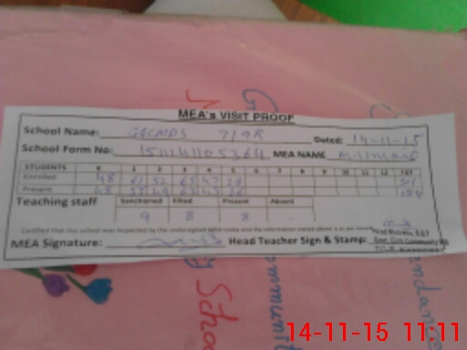 | Attendance Register | Head Teacher | MEA with School | Visit Proof |