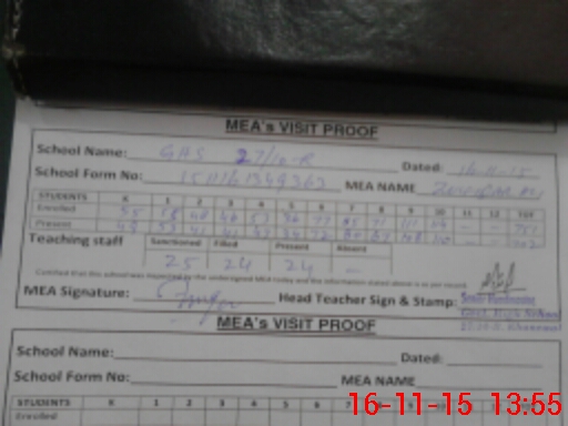 | Attendance Register | Head Teacher | MEA with School | Visit Proof |