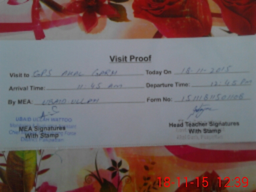 | School Visited by School Health & Nutrition Supervisor (No. of Visits) | 1 | Name1: | HASEEB UD DIN | Name2: | |