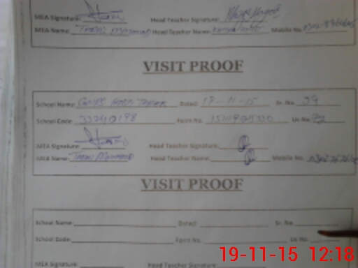 | School Visited by School Health & Nutrition Supervisor (No. of Visits) | 1 | Name1: | M YOUSAF TARIQ | Name2: | |