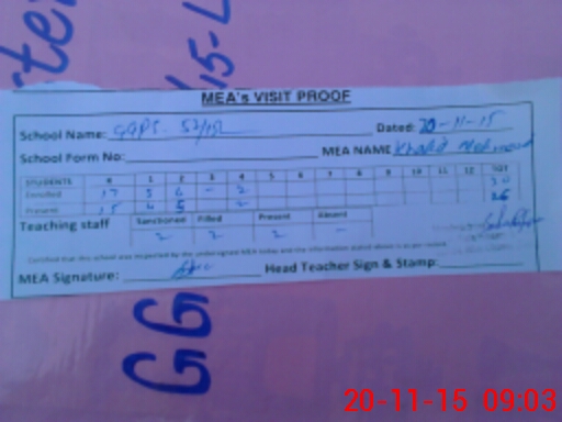 | Attendance Register | Head Teacher | MEA with School | Visit Proof |