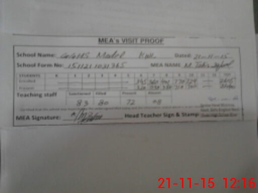 | Attendance Register | Head Teacher | MEA with School | Visit Proof |