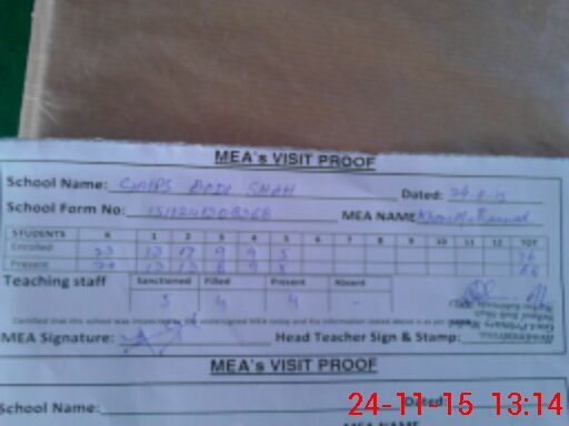 | Attendance Register | Head Teacher | MEA with School | Visit Proof |