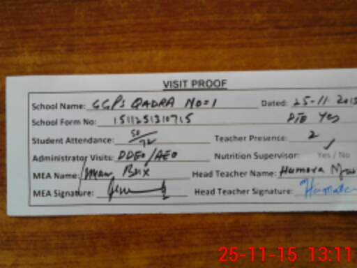 | School Visited by School Health & Nutrition Supervisor (No. of Visits) | 1 | Name1: | Zahoor Ahmed | Name2: | Nil |