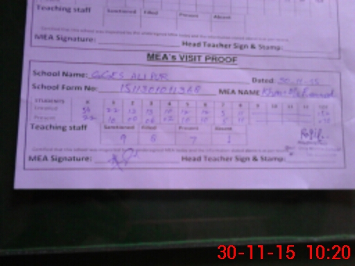 | Attendance Register | Head Teacher | MEA with School | Visit Proof |
