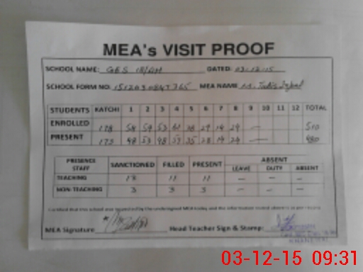 | Attendance Register | Head Teacher | MEA with School | Visit Proof |