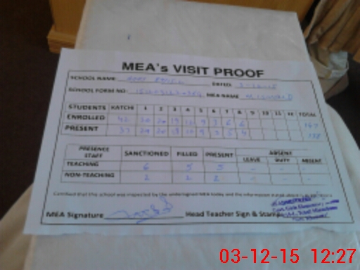 | Attendance Register | Head Teacher | MEA with School | Visit Proof |