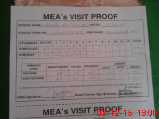 | Attendance Register | Head Teacher | MEA with School | Visit Proof |