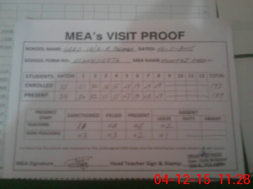 | Attendance Register | Head Teacher | MEA with School | Visit Proof |