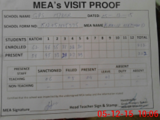 | Attendance Register | Head Teacher | MEA with School | Visit Proof |