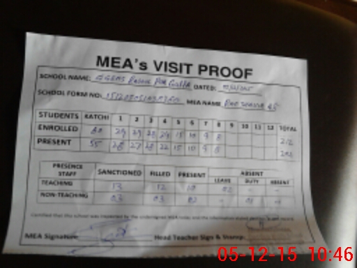 | Attendance Register | Head Teacher | MEA with School | Visit Proof |