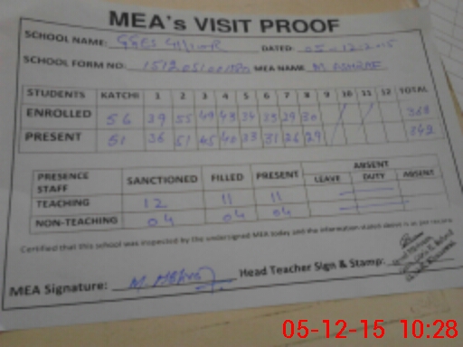 | Attendance Register | Head Teacher | MEA with School | Visit Proof |