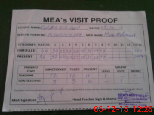 | Attendance Register | Head Teacher | MEA with School | Visit Proof |